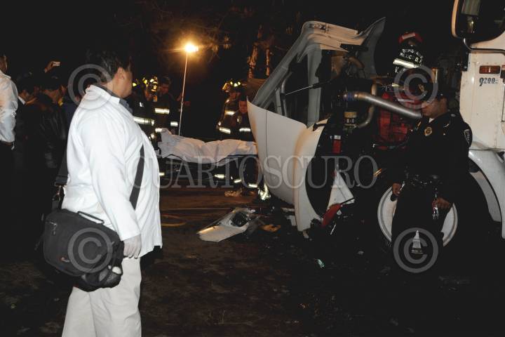 MÉXICO D.F., 24MAYO2013.- Cinco personas pierden la vida al quedar aplastados dentro del auto Seat, por un trailer que quedo sin frenos en la bajada de la carretera Picacho Ajusco a la altura del Km. 11 en la colonia Torres de Padierna delgación Tlalpan. Peritos y bomberos de esta demarcación acuieron al lugar para el rescate de los cuerpos. FOTO: LUIS CARBAYO /CUARTOSCURO.COM