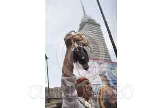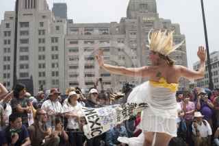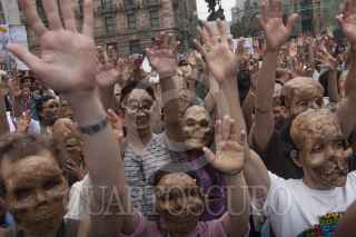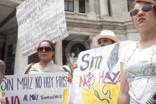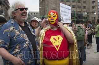 MÉXICO, D.F., 25MAYO2013.- El político Marco Rascón y Super Barrio acudieron a las afueras del Palacio de Bellas Artes para protestar por las solicitudes que el gobierno Mexicano otorgó a la compañía Monsanto para sembrar maíz transgénico al norte del país, concretamente en los estados de Chihuahua, Coahuila y Durango, asistieron también diversas organizaciones que denuncian que ese maíz presenta modificaciones genéticas que la hacen resistente a plagicidas y herbicidas por lo que la compañía aplica tratamientos agresivos a cientos de hectáreas cultivadas, este hecho ha provocado que comunidades aledañas recientan los efectos de dichos pesticidas, afirman las ONGs. FOTO: FRANCISCO RODRÍGUEZ /CUARTOSCURO.COM