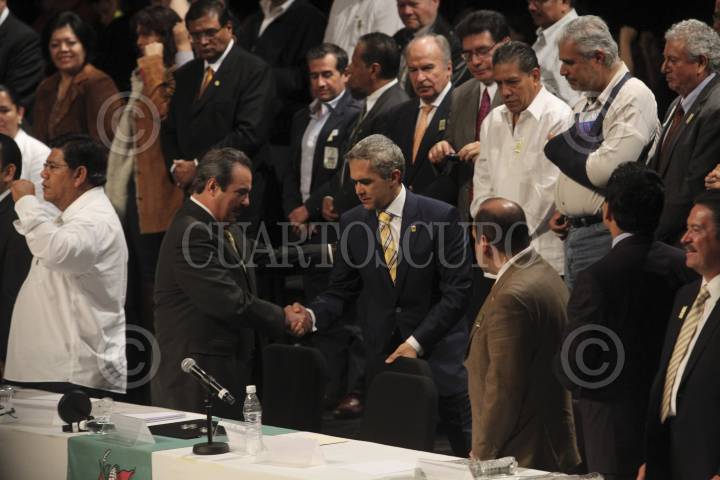 MÉXICO, D.F., 25MAYO2013.- Carlos Ramírez Marín, Secretario de Desarrollo Agrario, Territorial y Urbano (SEDATU), saluda a Miguel Ángel Mancera, Jefe de Gobierno del Distrtio Federal durante el Congreso Nacional con la Central Campesina. FOTO: SAÚL LÓPEZ / CUARTOSCURO.COM