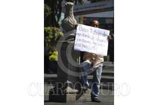 CUERNAVACA, MORELOS, 27MAYO2013.- Un desempleado desesperado ha optado por instalarse en el zócalo de la ciudad para ofrecer su mano de obra al mejor postor, este es un reflejo de la necesidad de empleo que se vive actualmente. FOTO: ALMA LAFAYET /CUARTOSCURO.COM