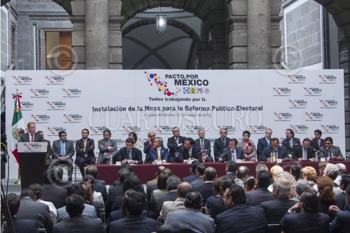 MÉXICO, D.F., 27MAYO2013.- Miguel Ángel Osorio Chong, Secretario de Gobernación junto a Gustavo Madero, Presidente Nacional del PAN; Jesús Zambrano, Presidente del PRD y Cesar Camacho Solís Presidente del PRI durante la Instalación de la Mesa para la Reforma Político-Electoral. FOTO: ENRIQUE ORDÓÑEZ /CUARTOSCURO.COM