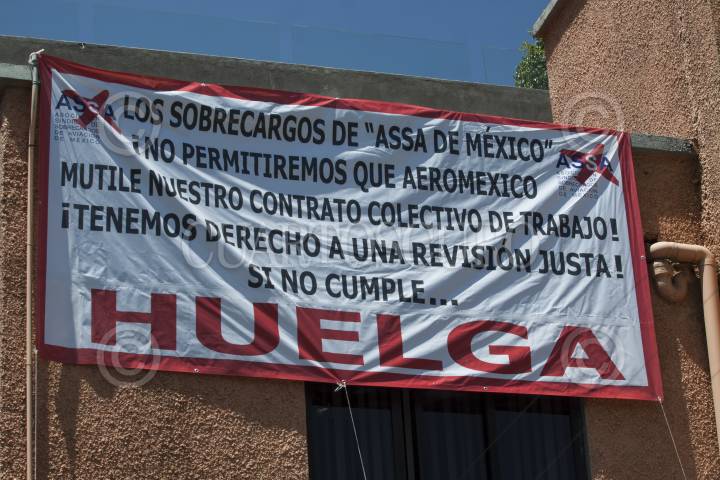 MÉXICO, D.F., 31MAYO2013.- En la sede de la Asociación Sindical de Sobrecargos de Aviación se colocó una manta en alusión a la posible huelga que estallará la media noche de hoy si no se concreta un acuerdo entre los trabajadores de esta asociación y la aerolínea Aeromexico. FOTO: RODOLFO ANGULO /CUARTOSCURO.COM