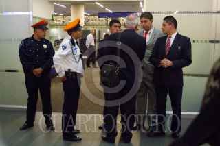 MÉXICO, D.F., 11JUNIO2013.-Guardias personales del exgobernador de Tabasco, Andrés Granier, salen custodiandolo del Aereopuerto Internacional de la Ciudad de México. Luego de su llegada enmedio de reporteros. FOTO: JUAN PABLO ZAMORA /CUARTOSCURO.COM