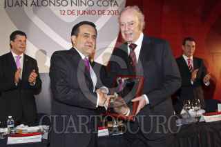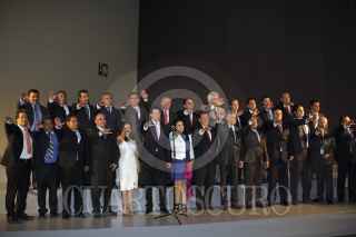 GUADALAJARA, JALISCO, 12JUNIO2013.- Ildefonso Guajardo Villarreal, Secretario de Economía; y Jorge Aristoteles Sandoval, Gobernador del Estado; en el evento en donde rindió protesta al nuevo Titular del Consejo de Cámaras Industriales de Jalisco (CCIJ), Juan Alonso Niño Cota y a su gabinete. También entregaron un reconocimiento al Presidente del Consejo Arancia Industrial, Ignacio Aranguren Castiello, por ser el primer coordinador del (CCIJ) hace 50 años. FOTO: FERNANDO CARRANZA GARCÍA /CUARTOSCURO.COM