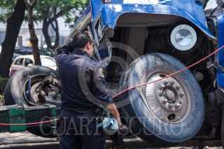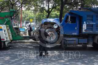 MÉXICO, D.F., 17JUNIO2013.- Un camion Tipo volteo, chco contra un tren sobre la avenida Rio San Joaquin y Lago Hielmar sin que resultaran personas heridas. Luego de varias horas el transito volvio a la normalidad. FOTO: ENRIQUE ORDÓÑEZ /CUARTOSCURO.COM