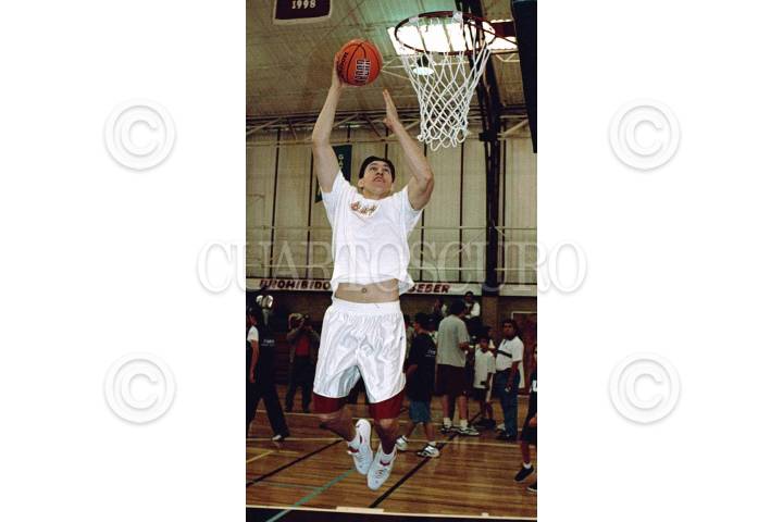 Los mexicanos Eduardo Najera y Jorge Rochín durante la clinica de basquetbol en el colegio americano esta mañana.