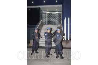 MÉXICO, D.F., 20JUNIO2013.- Francisco Domínguez, senador del PAN, acudió a la llamada Torre Azul, la cual es donde los senadores panistas tienen sus oficinas, para tomar posesión como vicecoordinador de la bancada, mostrando unos papeles que lo acreditan como tal, según lo afirmó. El día de ayer un grupo de senadores blanquiazules se reunieron y cambiaron los estatutos de la bancada para quitarle el manejo de los recursos a el actual coordinador Jorge Luis Preciado, quien mando a desalojar la Torre Azul y pidió la presencia de un ministerio público. En la imagen policías afuera de las mencionada torre y la salida de la ministerio público quien no ofreció declaraciones a los medios. FOTO: JUAN PABLO ZAMORA /CUARTOSCURO.COM