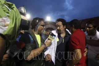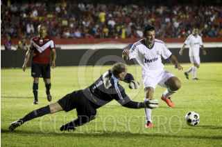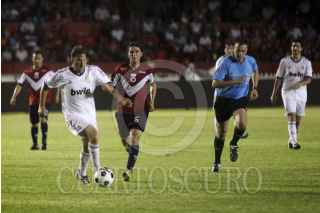 BOCA DEL RÍO, VERACRUZ, 20JUNIO2013.- Acciones del encuentro solidario entre las estrellas de los Tiburones Rojos del Veracruz y el Club de Futbol Real Madrid, quienes golearon al equipo local 6 goles a 1. El delantero merengue, Luis Figo y el entrenador visitante, Hugo Sánchez, fueron los más ovacionados por parte del equipo español. A su vez los jugadores escualos Antonio Carlos Santos, Omar Palma y Ángel "Matute" Morales se llevaron los aplausos de los aficionados que aguantaron una torrencial lluvia. FOTO: FÉLIX MÁRQUEZ /CUARTOSCURO.COM