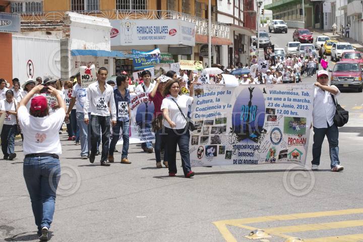 VILLAHERMOSA, TABASCO, 23JUNIO2013.- Al menos dos centenar de pobladores de esta capital marcharon en favor de que se instaure una ley que proteja la vida animal; caminaron por céntricas calles hasta llegar al H. Congreso local para exigir vida digna. En esta marcha participaron las asociaciones Mupra, Una Mejor Vida A.C., Probian y Esperanza A.C. todos los inconformes llevaban consignas y en su caminata pedían respeto para la vida animal. FOTO: MARCO POLO GUZMÁN HERNÁNDEZ/CUARTOSCURO.COM