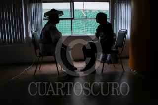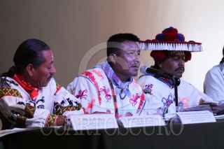 MÉXICO, D.F., 25JUNIO2013.- Jesús Lara Chivarra, del Frente en Defensa de Wirikuta de la Mesa de Comunicación, Sebastián Carrillo Carrillo, Presidente del Comisariado de Bienes Comunales de la Comunidad Autónoma de Bancos de San Hipólito, Juan Torres González, Presidente del Comisariado de Bienes Comunales de Santa Catarina Cuexcomatlán y Cristian Alejandro Chávez, del Frente en Defensa de Wirikuta, presentaron ante los medios la campaña de hostigamiento realizada por el Consejo de Administración de la Reserva Ecológica , el gobierno estatal y federal. Exigieron la cancelación total de las concesiones a los proyectos mineros del Área Natural Protegida. FOTO: ADOLFO VALTIERRA /CUARTOSCURO.COM