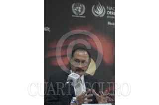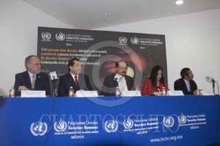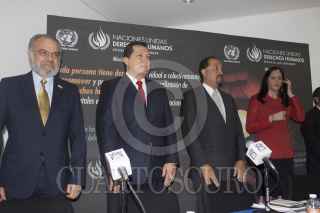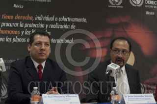 MÉXICO, D.F., 26JUNIO2013.- Raúl Plascencia Villanueva, presidente de la Comisión Nacional de Derechos Humanos y Javier Hernández Valencia, representante en México de la Alta Comisionada de las Naciones Unidas por los Derechos Humanos, durante la presentación sobre la situación de las y los defensores de derechos humanos en México presentado por la oficina del Alto Comisionado de la ONU, en Casa Lamm. FOTO: MOISÉS PABLO / CUARTOSCURO.COM