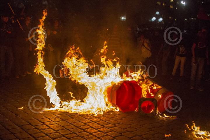 MÉXICO, D.F., 01JULIO2013.- Tras de varias horas un grupo de jóvenes Anarquistas, luego de realizar una marcha del Ángel de la Independencia a la Torre de PEMEX y de regresó, culminaron en la Plancha del Zócalo Capitalino, esto acompañado de un fuerte dispositivo de seguridad que implemento la Secretaria de Seguridad del Distrito Federal. FOTO: GUILLERMO PEREA /CUARTOSCURO.COM