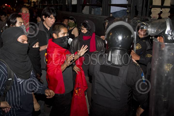 MÉXICO, D.F., 01JULIO2013.- Tras de varias horas un grupo de jóvenes Anarquistas, luego de realizar una marcha del Ángel de la Independencia a la Torre de PEMEX y de regresó, culminaron en la Plancha del Zócalo Capitalino, esto acompañado de un fuerte dispositivo de seguridad que implemento la Secretaria de Seguridad del Distrito Federal. FOTO: GUILLERMO PEREA /CUARTOSCURO.COM