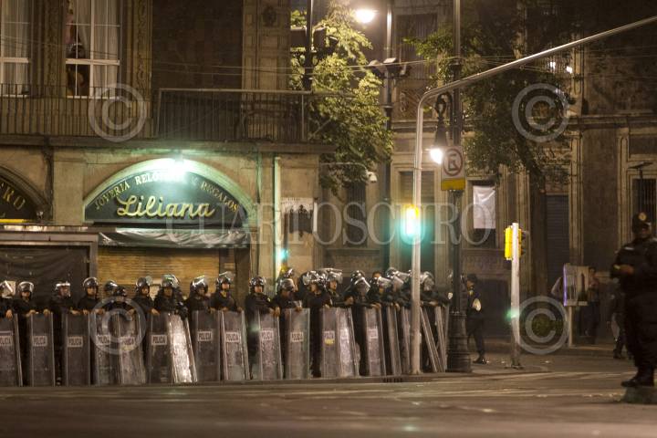 MÉXICO, D.F., 01JULIO2013.- Tras de varias horas un grupo de jóvenes Anarquistas, luego de realizar una marcha del Ángel de la Independencia a la Torre de PEMEX y de regresó, culminaron en la Plancha del Zócalo Capitalino, esto acompañado de un fuerte dispositivo de seguridad que implemento la Secretaria de Seguridad del Distrito Federal. FOTO: GUILLERMO PEREA /CUARTOSCURO.COM