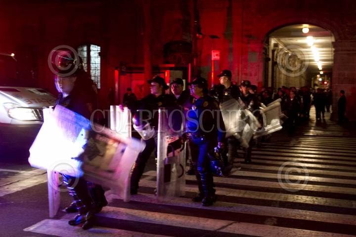 MÉXICO, D.F., 01JULIO2013.- Tras de varias horas un grupo de jóvenes Anarquistas, luego de realizar una marcha del Ángel de la Independencia a la Torre de PEMEX y de regresó, culminaron en la Plancha del Zócalo Capitalino, esto acompañado de un fuerte dispositivo de seguridad que implemento la Secretaria de Seguridad del Distrito Federal. FOTO: GUILLERMO PEREA /CUARTOSCURO.COM