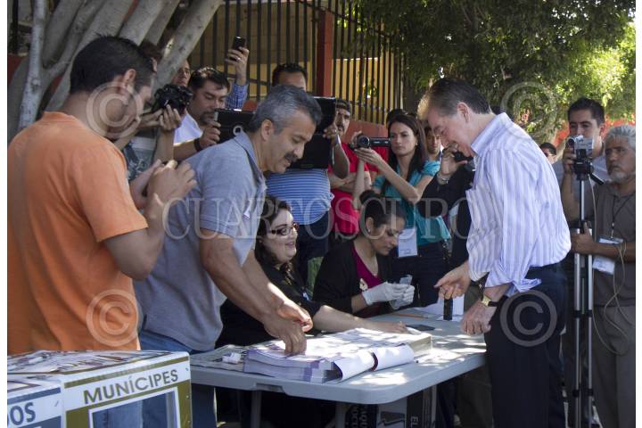 TIJUANA, BAJA CALIFORNIA, 07JULIO2013.-Manlio Fabio Beltrones, Coordinador del PRI en la Camara de Diputados junto a Fernando Castro Trenti candidato a gobernador por el PRI y Cesar Camacho Quiroz, Presidente Nacional del PRI durante la votacion de Castro Trenti en la casilla basica del distrito 8 en Playas de Tijuana. FOTO: CUARTOSCURO.COM