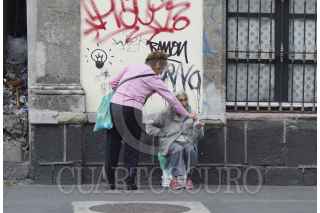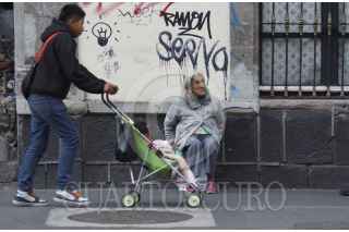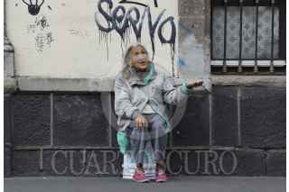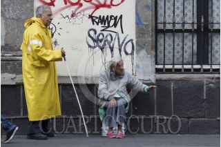 MÉXICO, D.F., 11JULIO2013.- Sentada en una cubeta de plástico, Guadalupe de 85 años de edad y que sufre de ceguera total, pide limosna a las personas que caminan por la calle Isabel la Católica, casi esquina con Izazaga. La señora recibe monedas, galletas y chocolates de los pocos transeúntes que sienten compasión por ayudarla. En la imagen, un señor ciego camina junto a ella. FOTO: DIEGO SIMÓN SÁNCHEZ /CUARTOSCURO.COM