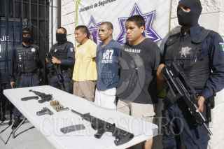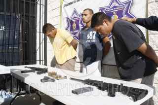 CIUDAD JUÁREZ, CHIHUAHUA, 11JULIO2013.- Policías municipales detuvieron en la colonia Bellavista a tres hombres a quienes se les acusa de ataque contra agentes de la corporación ayer en la Posada Pompa. Según informó el vocero de la Secretaría de Seguridad Pública Municipal, Adrián Sánchez, que los tres hombres que se les acusa del ataque contra el agente responden al nombre de Édgar Raúl Ramos Rico de 23, José Andrés Bustamante de 27 y José Lucio Hernández de 29 años de edad. Se les aseguró arma de fuego 7.42x39, otra .223 con cinco cartuchos y arma tipo escuadra .45. FOTO: NACHO RUIZ /CUARTOSCURO.COM