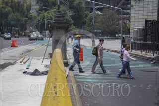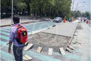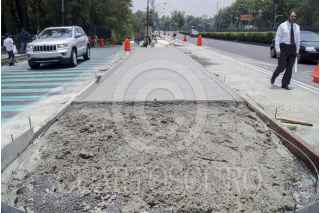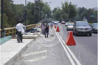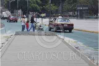 MÉXICO, D.F., 15JULIO2013.- Trabajadores del Gobierno del Distrito Federal construyen una banqueta sobre Paseo de la Reforma a la altura de la Estela de la Luz que cruza el puente sobre Circuito Interior y llega hasta el Museo de Arte Moderno. La banqueta ayuda a evitar accidentes entre las personas que a diario transitan por el lugar. FOTO: DIEGO SIMÓN SÁNCHEZ /CUARTOSCURO.COM