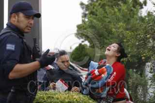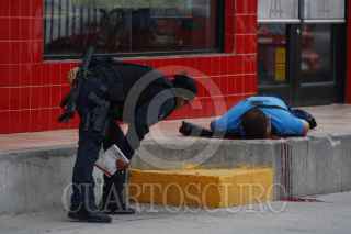 CIUDAD JUÁREZ, CHIHUAHUA 15JULIO2013.- Sujetos a bordo de dos camionetas privaron de la vida a hombre en el estacionamiento de un restaurante McDonald's, ubicado en avenida Tecnológico casi cruce con Pedro Rosales de León. Según testigos varios hombres a bordo de dos camionetas, una roja y una negra, abordaron al hombre cuando salía del restaurante junto con su familia y a corta distancia le dispararon ocho veces. La esposa de la víctima cargaba a su bebé al momento de la ejecución quien sufrió crisis emocional al ver la muerte de su pareja, mientras que los agentes la aseguraron para entrevistarla. FOTO:NACHO RUÍZ /CUARTOSCURO.COM