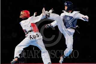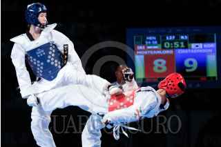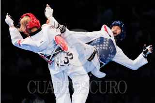 PUEBLA, PUEBLA, 15JULIO2013.- El coreano Tae-Moon Cha se llevó la medalla de oro al vencer al iraní Hadi Mostean Loron, en el primer día de actividades del Campeonato Mundial de Taekwondo 2013 realizado en la ciudad de Puebla. FOTO: HILDA RIOS /CUARTOSCURO.COM