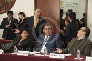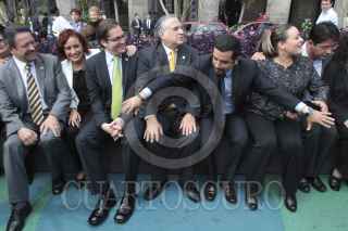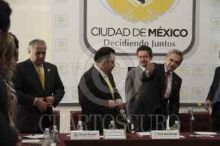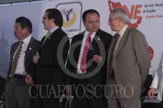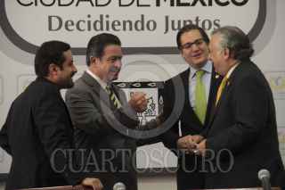 MÉXICO, D.F., 18JULIO2013.- Carlos Navarrete, secretario del Trabajo, Leticia Quezada, jefea delegacional de la Magdalena Contreras, Salomón Chertorivski, secretario de Desarrollo Económico, Alejandro Fernández, jefe delegacional de Cuauhtémoc, y Héctor Serrano, secretario de Gobierno, durante la Firma del Convenio de Colaboración entre las 16 delegaciones y la Secretaría del Trabajo del DF con el que se llevaran a cabo acciones para emplear a jóvenes. Dentro de esos acuerdos se encuentra la "Expo-Empleo para Jóvenes. Vive y Trabaja en tu Delegación", que dió inicio hoy en el Zócalo. FOTO: JUAN PABLO ZAMORA /CUARTOSCURO.COM