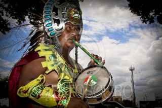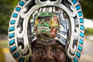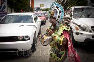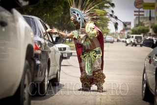 CULIACAN, SINALOA, 20JULIO2013.- Jose Luis proveniente de la ciudad de México, tiene alrededor de 2 semanas en las principales avenidas de Culiacán en donde realiza una danza Mixteca la cual representa al dios de la lluvia, heredara por sus papas y abuelos en la ciudad de Oaxaca de donde el es originalmente. Jose Luis decidió venir al norte en estas vacaciones de verano en compañía de sus 2 hijos y su esposa a probar suerte y sacar unas monedas extras para mantener a su familia, el se dedicaba a la siembra de maíz y frijol en su ciudad natal Oaxaca sin embargo decidió migrar a la gran ciudad de México ya que las cosechas ya no alcanzaban para comer, en la ciudad se dedica a la albañilería sin embargo el trabajo es muy escaso y obliga a las personas a ir a otros estados de la república en busca de mejores oportunidades, conservando las raíces de nuestros antepasados con danzas milenarias. FOTO: RASHIDE FRIAS /CUARTOSCURO.COM