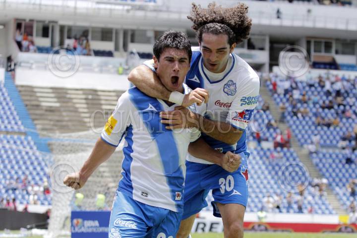 PUEBLA, PUEBLA, 21JULIO2013.- Matías Alustiza festeja el gol del empate por marcador de 1-1 conseguido ante los Pumas de CU, disputado con el Puebla de la Franja en jornada 1 del torneo de Apertura del fútbol mexicano celebrado en el estadio Cuauhtémoc. FOTO: HILDA RIOS /CUARTOSCURO.COM