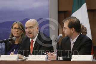 MÉXICO, D.F., 24JULIO2013.- Helena Molina Valdés, directora de la campaña de la EIRD, Juan José Guerra Abud, secretario del Medio Ambiente y Recursos Naturales y Roberto Dondisch, director general para Temas Globales en la Secretaria de Relaciones Exteriores, durante la reunión del grupo de trabajo de la coalición clima y aire limpio para reducir los contaminantes de vida corta, que se realizó en la Secretaría de Relaciones Exteriores. FOTO: ISAAC ESQUIVEL /CUARTOSCURO.COM
