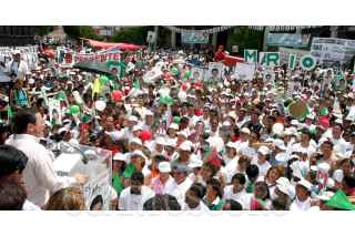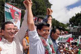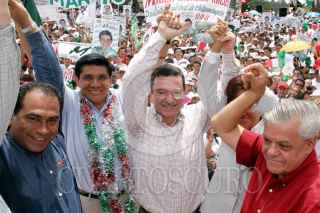 CHILPANCINGO, GUERRERO 25SEPTIEMBRE2005.- La tarde de esta sabado se llevó a cabo el cierre de campaña de lo candidatos priístas de la zona centro del estado de Guerrero, en la foto, Los presidentes, nacional y estatal, Mariano Palacios Alcocer y Héctor Astudillo Flores flanquean al candidato a alcalde Mario Moreno Arcos. FOTO: Juan Flores/CUARTOSCURO.COM