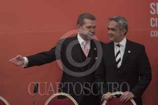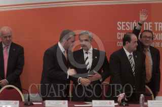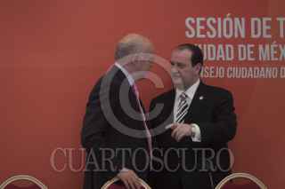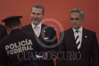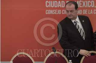 MÉXICO, D.F., 25JULIO2013.- Meyer Klip, presidente de Verificación Administrativa del DF, Luis Wertman, presidente del Consejo Ciudadano de Seguridad Pública y Procuración de Justicia, Miguel Ángel Mancera, Jefe de Gobierno, Rodolfo Fernando Ríos Garza, Procurador General de Justicia del DF y Fernando Macías Cué, coordinador general de Comunicación Social en el Distrito Federal, durante el informe de actividades 2013 del programa del Consejo Ciudadano de la Ciudad de México "Terminales Seguras". FOTO: MOISÉS PABLO /CUARTOSCURO.COM