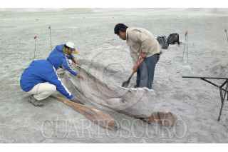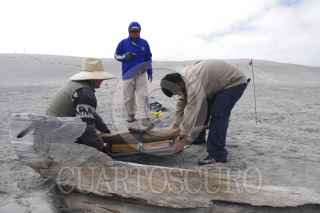 BAJA CALIFORNIA, 25JULIO2013.- Expertos del INAH rescataron la proa de una antigua embarcación, la cual se encontró en las dunas de las costas del complejo lagunar Ojo de Liebre y Guerrero Negro, en Baja California. En los límites sur del estado de Baja California, en las dunas de las costas del complejo lagunar Ojo de Liebre y Guerrero Negro, se rescató la proa de una canoa de 210 años de antigüedad, posiblemente fabricada por indígenas bajacalifornianos o arrastrada por las corrientes del norte, y reutilizada por los grupos que habitaron la península. FOTO: LAURA ROMERO /CUARTOSCURO.COM