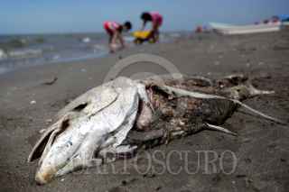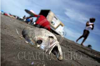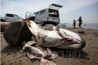 ALVARADO, VERACRUZ., 28JULIO2013.- Decenas de peces de la especie Jurel amarillo aparecieron muertos en la orilla de las playas de Antón Lizardo, municipio de Alvarado. Los pescadores de la zona refirieron que desde temprana hora empezaron a flotar en toda la costa, algunos en avanzado estado de descomposición. Cabe resaltar que en días pasados se registró la aparición de una ballena juvenil, una tortuga y cientos de mantarrayas muertas. Especialistas investigan un posible ecocidio por parte de Petróleos Mexicanos quien realiza implosiones submarinas para detectar nuevos yacimientos. FOTO: FÉLIX MÁRQUEZ / CUARTOSCURO.COM