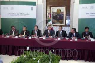 MÉXICO, D.F., 01AGOSTO2013.- El Secretario de Gobernación, Miguel Ángel Osorio Chong, convocó a todas las fuerzas políticas y de la sociedad del estado de Michoacán, encabezadas por el Gobernador Jesús Reyna García, a un Acuerdo por Michoacán, para devolverle la paz y el desarrollo a la entidad. En la reunión estuvieron dirigentes de todas las fuerzas políticas, legisladores federales y locales, presidentes municipales y representantes del sector empresarial y de la sociedad civil organizada. El Secretario de Gobernación dijo que la instrucción del Presidente Enrique Peña Nieto es que además de devolverles la seguridad a los ciudadanos, se tienen que establecer políticas públicas para lograr un desarrollo duradero en la entidad. FOTO: SEGOB /CUARTOSCURO.COM