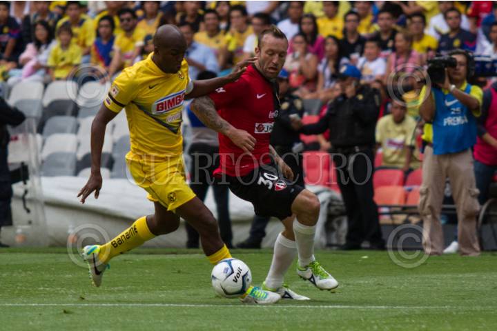 MÉXICO, D.F., 03AGOSTO2013.- Jugadores del América, festejan el primer gol, durante el encuentro correspondiente a la jornada 4 del Torneo Apertura 2013 de la Liga MX, entre las Aguilas del América contra los Zorros del Atlas. FOTO: MISAEL VALTIERRA / CUARTOSCURO.COM
