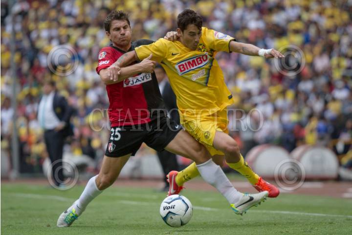 MÉXICO, D.F., 03AGOSTO2013.- Jugadores del América, festejan el primer gol, durante el encuentro correspondiente a la jornada 4 del Torneo Apertura 2013 de la Liga MX, entre las Aguilas del América contra los Zorros del Atlas. FOTO: MISAEL VALTIERRA / CUARTOSCURO.COM