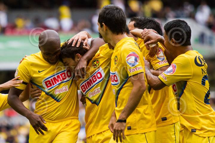 MÉXICO, D.F., 03AGOSTO2013.- Jugadores del América, festejan el primer gol, durante el encuentro correspondiente a la jornada 4 del Torneo Apertura 2013 de la Liga MX, entre las Aguilas del América contra los Zorros del Atlas. FOTO: MISAEL VALTIERRA / CUARTOSCURO.COM