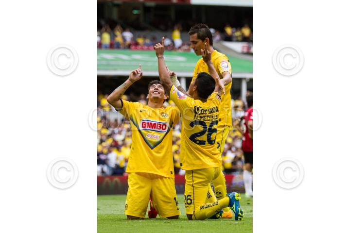 MÉXICO, D.F., 03AGOSTO2013.- Jugadores del América, festejan el primer gol, durante el encuentro correspondiente a la jornada 4 del Torneo Apertura 2013 de la Liga MX, entre las Aguilas del América contra los Zorros del Atlas. FOTO: MISAEL VALTIERRA / CUARTOSCURO.COM