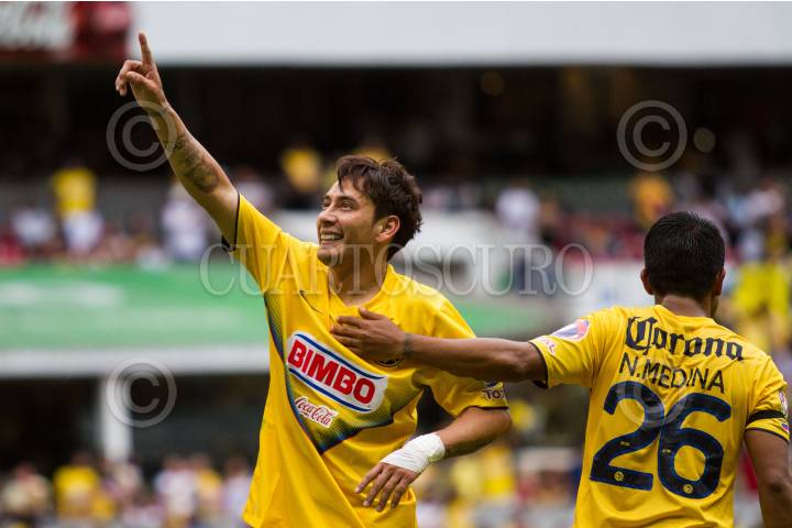 MÉXICO, D.F., 03AGOSTO2013.- Jugadores del América, festejan el primer gol, durante el encuentro correspondiente a la jornada 4 del Torneo Apertura 2013 de la Liga MX, entre las Aguilas del América contra los Zorros del Atlas. FOTO: MISAEL VALTIERRA / CUARTOSCURO.COM