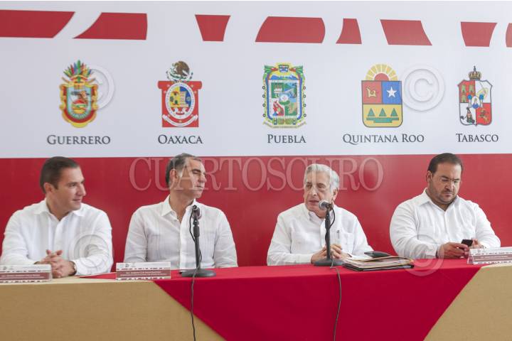 VILLAHERMOSA, TABASCO, 06AGOSTO2013.- Los gobernadores, Rafael Moreno Valle (Puebla), Gabino Cué Monteagudo, (Oaxaca), Arturo Núñez Jiménez, (Tabasco) y Javier Duarte de Ochoa, (Veracruz) durante la Instalación de la Comisión para El Desarrollo Integral de la Región Sur-Sureste (CONAGO), que se efectúo en el Palacio de Gobierno local. Ahí los cuatro mandatarios ofrecieron una rueda de prensa para los medios informativos. FOTO: MARCO POLO GUZMÁN HERNÁNDEZ/CUARTOSCURO.COM