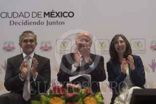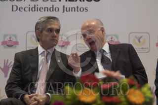 MÉXICO, D.F., 08AGOSTO2013.- Miguel Ángel Mancera, Jefe de Gobierno y José Narro Robles, rector de la UNAM, durante la presentación de la Plataforma de las Juventudes para la Ciudad de México en la Antigua Escuela de Medicina. FOTO: MOISÉS PABLO /CUARTOSCURO.COM