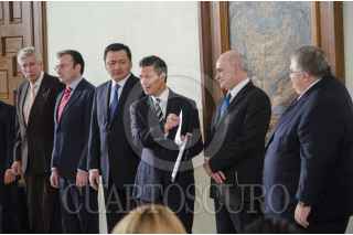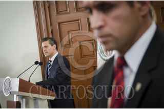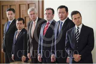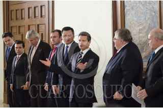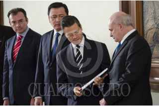MÉXICO, D.F., 09AGOSTO2013.- Enrique Peña Nieto, presidente de México, recibió de Eduardo Sojo-Garza Aldape, presidente del Instituto Nacional de Estadística y Geografía (INEGI), la lista de aspirantes a comisionados de la Comisión Federal de Competencia Económica (CFCE) y del Instituto Federal de Telecomunicaciones (IFT). El evento se realizó en el salón Venustiano Carranza de la Residencia Oficial de Los Pinos, al que arribaron Luis Videgaray Caso, secretario de Hacienda y Crédito Público; Miguel Ángel Osorio Chong, secretario de Gobernación y Agustín Carstens Carstens, presidente del Banco de México. FOTO: MISAEL VALTIERRA / CUARTOSCURO.COM