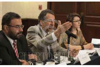 MÉXICO, D.F., 12AGOSTO2013.- Abelardo Ávila, del Instituto Nacional de Nutrición y Ciencias Médicas Salvador Zubirán; Alejandro Calvillo, director del Poder del Consumidor y Katia García, investigadora en salud alimentaria del Poder del Consumidor, ofrecieron una conferencia de prensa para presentar el documento "D.F. Políticas para la Prevención de la Obesidad" en donde se analizan 10 propuestas para combatir la obesidad en la capital del país. Las propuestas se presentaron a los diputados Rubén Escamilla y Ernestina Godoy para que puedan discutirse en la Asamblea Legislativa del Distrito Federal (ALDF). El decálogo propone que las políticas que emprenda el gobierno capitalino se enfoquen en regulaciones, incentivos económicos y cambio de ambiente, a fin de disponer de alimentos saludables, agua potable gratuita y espacios para la recreación y la movilidad. FOTO: DIEGO SIMÓN SÁNCHEZ /CUARTOSCURO.COM