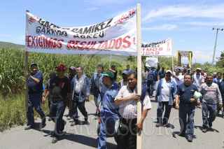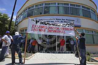 ZACATEPEC, MORELOS 12AGOSTO2013.- Tras parar actividades en el ingenio de Zacatepec, 1000 trabajadores pertenecientes a la sección 72 del sindicato azucarero, marcharon por el libramiento a Jojutla hasta la sub procuraduría del la Zona Sur Poniente, para reclamar al gobierno del estado de Morelos pare la ola de inseguridad que se ha presentado en la región, esto tras encontrar el cuerpo degollado de Emilio Romano Cruz, quien fuera trabajador del ingenio. Los manifestantes ingresaron a las instalaciones de la Procuraduría General de Justicia de la Zona para exigir saliera el subprocurador y se comprometiera a esclarecer el caso, así como otros cuatro que se han presentado en los días pasados, de lo contraría amenazaron con tomar las armas y defenderse. FOTO: ALMA LAFAYET /CUARTOSCURO.COM