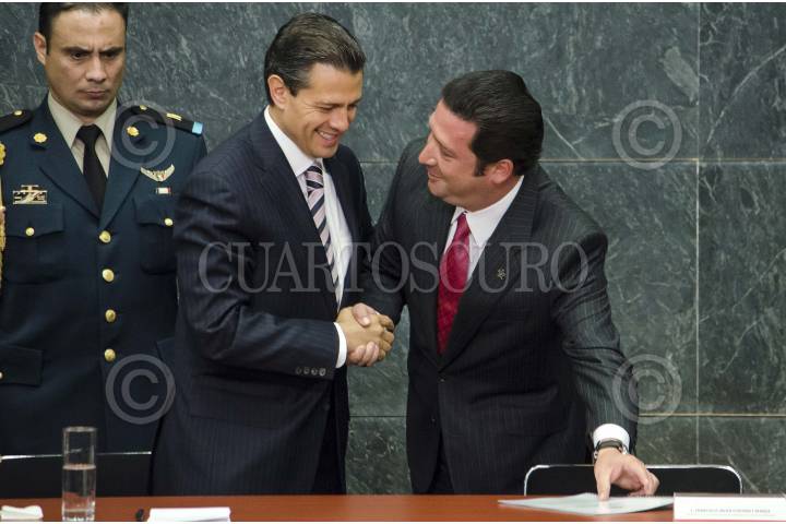 MÉXICO, D.F., 13AGOSTO2013.- Enrique Peña Nieto, presidente de México; encabezó la presentación de la Estratégia Integral de Suministro de Gas Natural. El presidente fue acompañado por el secretario de Energía Pedro Joaquín Coldwell; Ildefonso Guajardo, secretario de Economía; Emilio Lozoya Austin, director de Petroleos Mexicanos (Pemex); así como los presidentes de las comisiones de energía en el Senado y Cámara de Diputados; David Penchyna y Marco Antonio Bernal, respectivamente. El evento tuvo lugar en el salón Adolfo López Mateos de la Residencia Oficial de Los Pinos. FOTO: EMILIANO RUVAL / CUARTOSCURO.COM