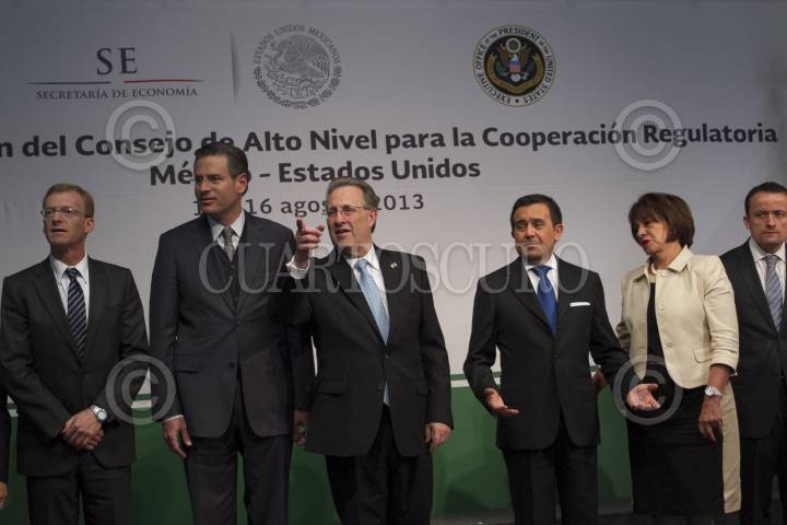 MÉXICO D.F., 15AGOSTO2013.- Ildefonso Guajardo, titular de la Secretaría de Economía y Anthony Wayne, embajador de Estados Unidos, durante la ceremonia inaugural de la 3ª Reunión del Consejo de Alto Nivel para la Cooperación Regulatoria entre México y Estados Unidos, en la Secretaría de Economía. FOTO: GUILLERMO PEREA /CUARTOSCURO.COM