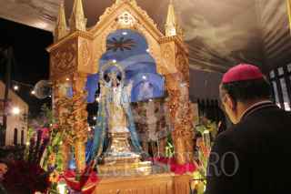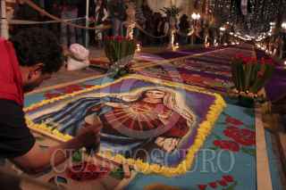 HUAMANTLA, TLAXCALA, 15AGOSTO2013.- Los días 14 y 15 de agosto son días de festejo nocturno en la “Noche que nadie duerme”, festividad que se realiza cada año en Huamantla, en donde el motivo es festejar a la Virgen de la Caridad. Visitantes nacionales y extranjeros son espectadores del momento en el que la Virgen es descendida del altar para después partir en procesión en un carro alegórico. Tapices de flores visten el paso de la imagen religiosa. FOTO: EMMANUEL FLORES / CUARTOSCURO.COM