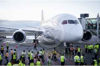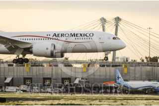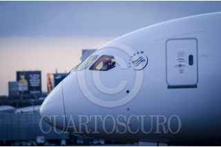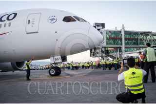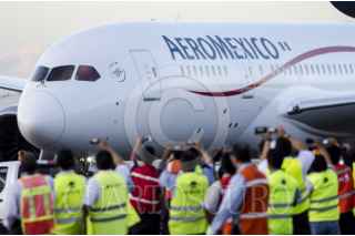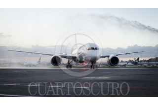 MÉXICO, D.F., 16AGOSTO2013.- Este viernes aterrizó en México el primero de los 19 aviones Boing 787 Dreamliner; la aeronave de Boeing había causado polémica por fallas en sus baterías. FOTO: MISAEL VALTIERRA / CUARTOSCURO.COM