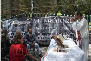 MÉXICO, D.F., 19AGOSTO2013.- Integrantes de la Familia Pasta de Conchos, Equipo Nacional de Pastoral Laboral y del Centro de Reflexión y Acción Laboral (CEREAL), realizaron una misa en las oficinas de Grupo México, como cada 19 de mes, en memoria de los 65 mineros sepultados en la mina carbonífera de Pasta de Conchos en febrero de 2006. Los manifestantes informaron que la prórroga que la Comisión Interamericana de Derechos Humanos de la OEA concedió al gobierno de Enrique Peña Nieto, Presidente de México, culminó. Por esa razón, exigen al gobierno definirse ante el sufrimiento que durante 90 meses han sufrido los familiares, e investigar y rescatar los cuerpos de los mineros. FOTO: ADOLFO VLADIMIR /CUARTOSCURO.COM