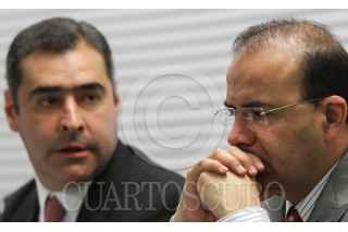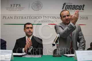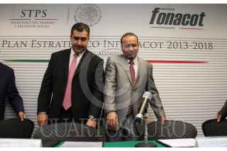 MÉXICO, D.F., 22AGOSTO2013.- César Alberto Martínez Baranda, Director General del Instituto Fonacot y Jesús Alfonso Navarrete Prida, Secretario del Trabajo y Prevensión Social, durante la firma del Plan Estratégico Infonacot 2013-2018. FOTO: ADOLFO VLADIMIR /CUARTOSCURO.COM
